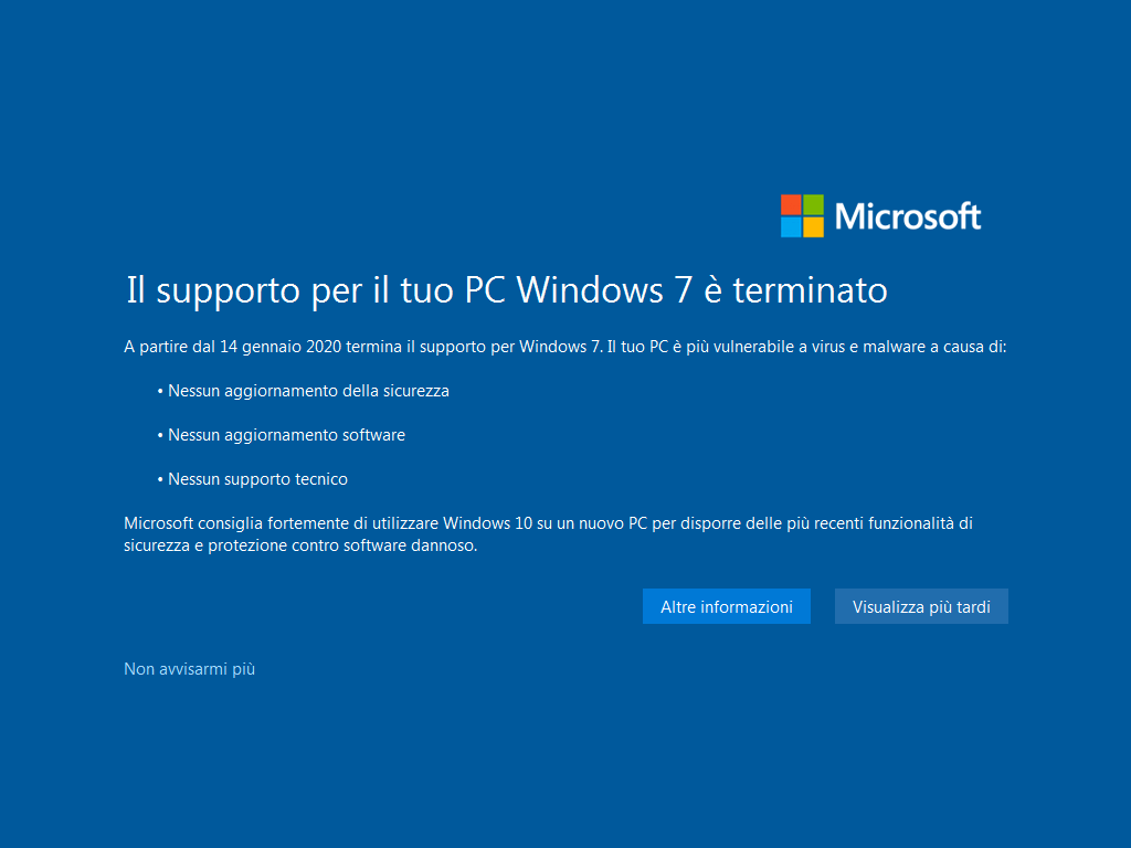 Qualcuno di voi nei mesi scorsi avrà ricevuto o letto qualcosa, in riferimento al termine del supporto operativo a Windows 7. Quali disagi tale scadenza può creare, è a larghe linee riassunto nel file sotto riportato. Ovviamente se avete già un personal computer aggiornato con il nuovo sistema di casa Microsoft, Windows 10, il presente articolo vi potrebbe interessare solo a scopo informativo e nulla di più.